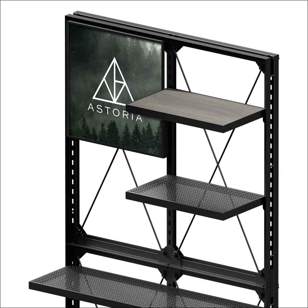 Astoria infuses timeless charm into today’s dynamic retail spaces, offering an effortless way to update your look. With its smart design, you can easily update your environment by replacing back panels. Astoria enhances the style your way, from the stark, edgy industrial cross-braces to the rugged appeal of urban mesh back panels. For a warmer look, select between four wood finishes, or design your own branded graphic panels.