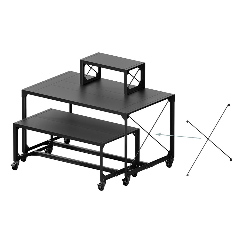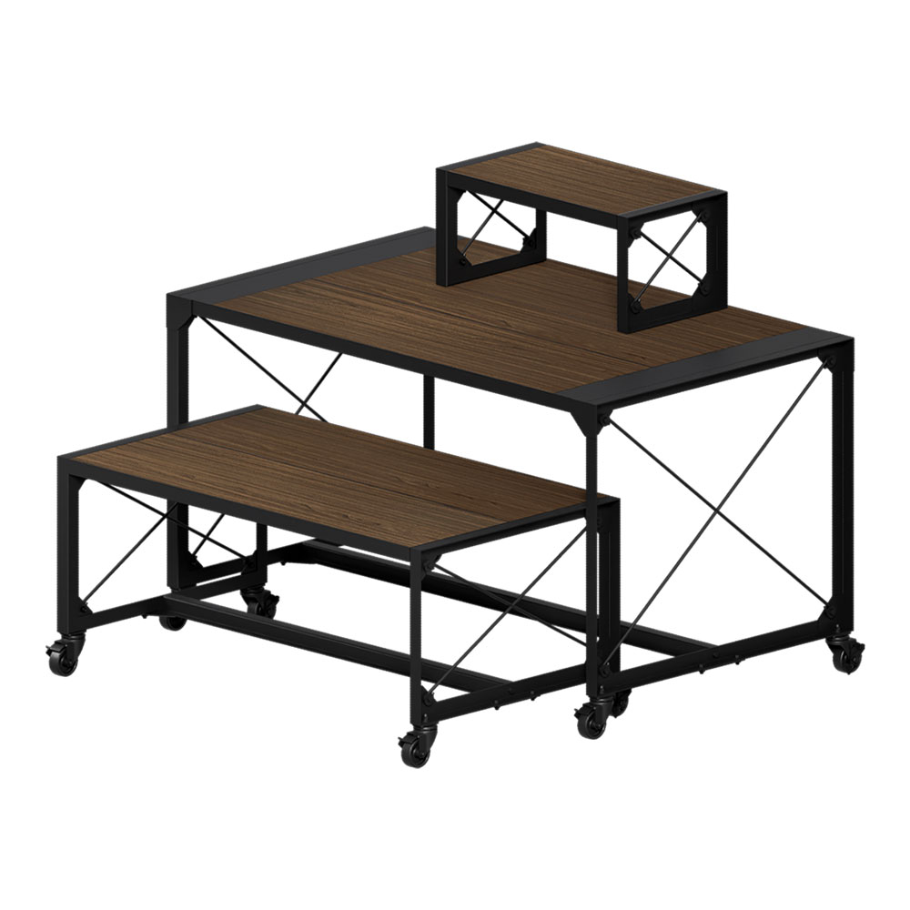 Meet the Astoria Nesting Tables, the perfect centerpiece for your store. With a matte black frame, choose between a black metal surface or wood laminate tops in four finishes. The set includes a small table, large table, and a riser with built-in cross braces. Optional Cross Braces add an industrial touch. These tables create tiered displays for better product visibility and dynamic presentations. Casters (2-locking) ensure easy mobility and secure placement.