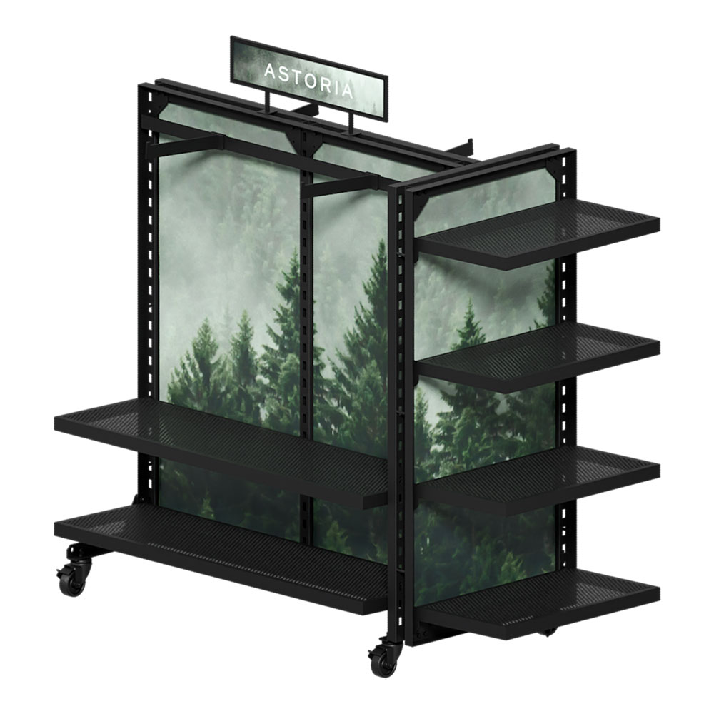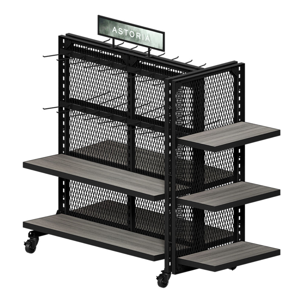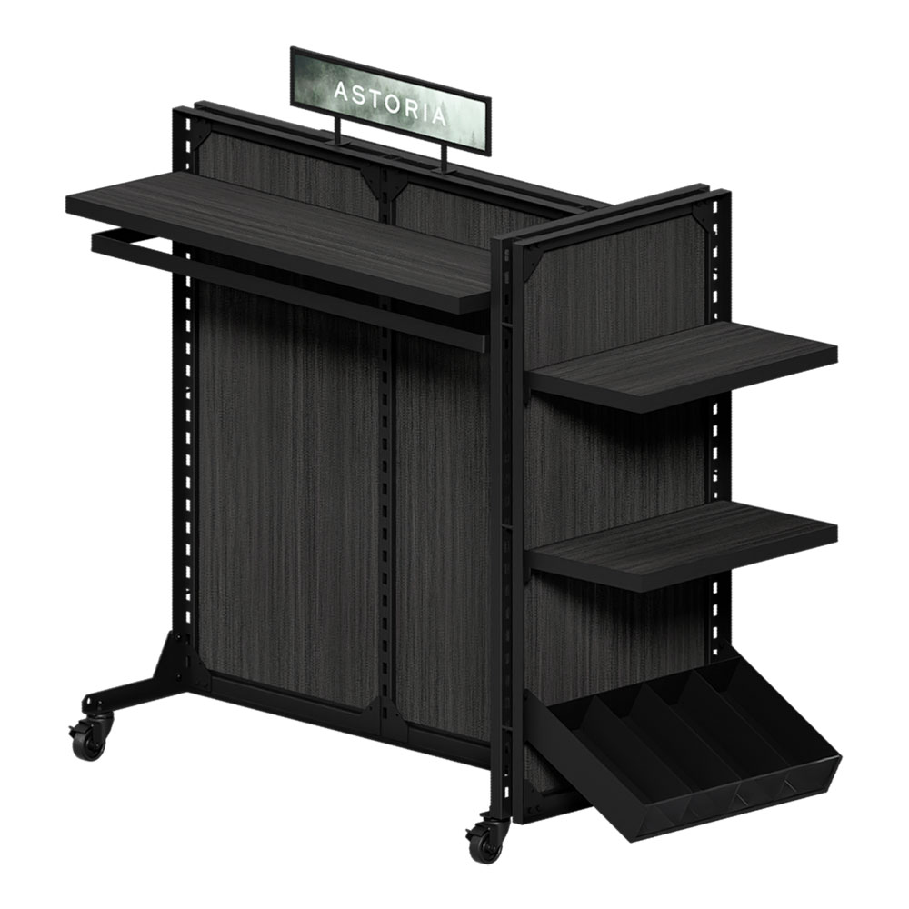 Meet the Astoria Modular 3-Way Rack, designed for retail spaces like apparel and gift shops. With a sleek matte black finish, 3″ casters for mobility, and optional back panels and cross braces, it combines style, flexibility, and functionality. Chamfered details highlight Astoria’s quality and innovation, making it a standout choice for modern retail.