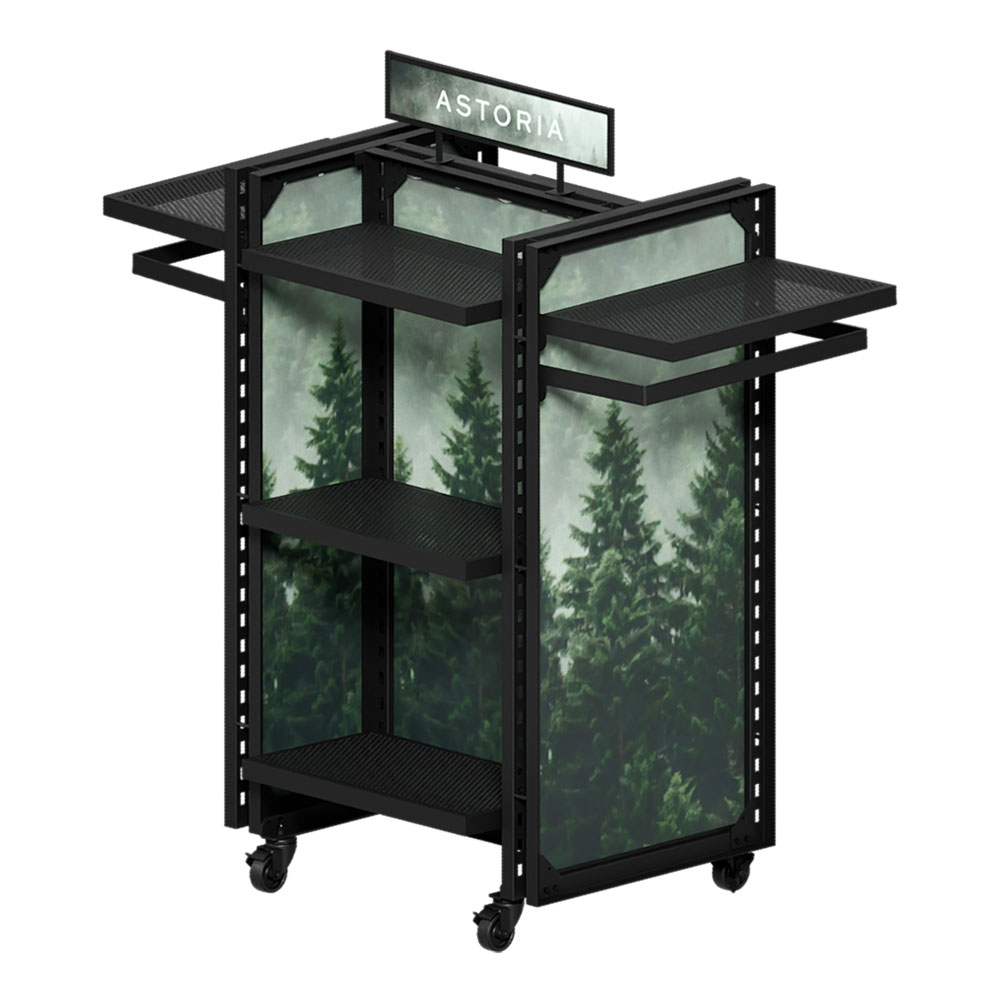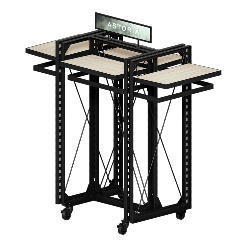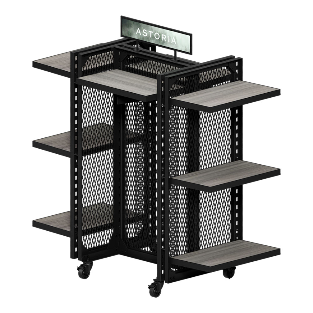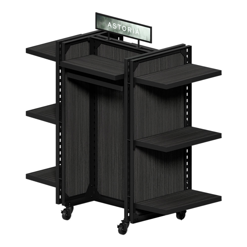 The Astoria 4-Way Rack, part of the modular Astoria system, blends industrial style with durability at a great value. Featuring a matte black finish, 3″ casters for mobility, and optional Back Panels and Cross Braces, it offers versatile, cost-effective display solutions for your retail space.